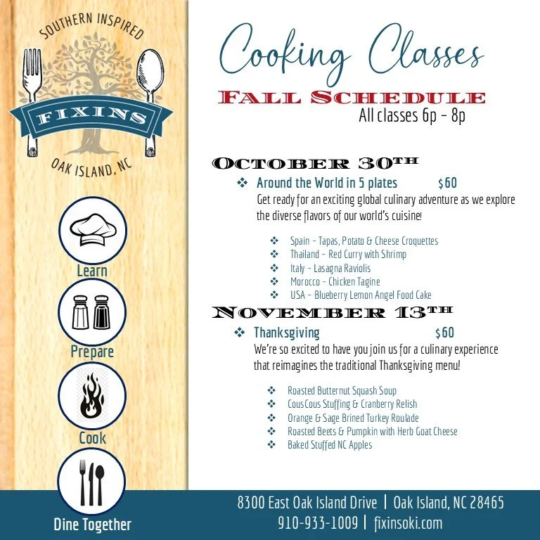 #FixinsCookingClass #LearnToCook #AroundTheWorld #ThanksgivingDinner #HolidayCooking #OakIslandEats #FoodiesOfNC #NCFoodies #CookingClassFun #EatLocalNC